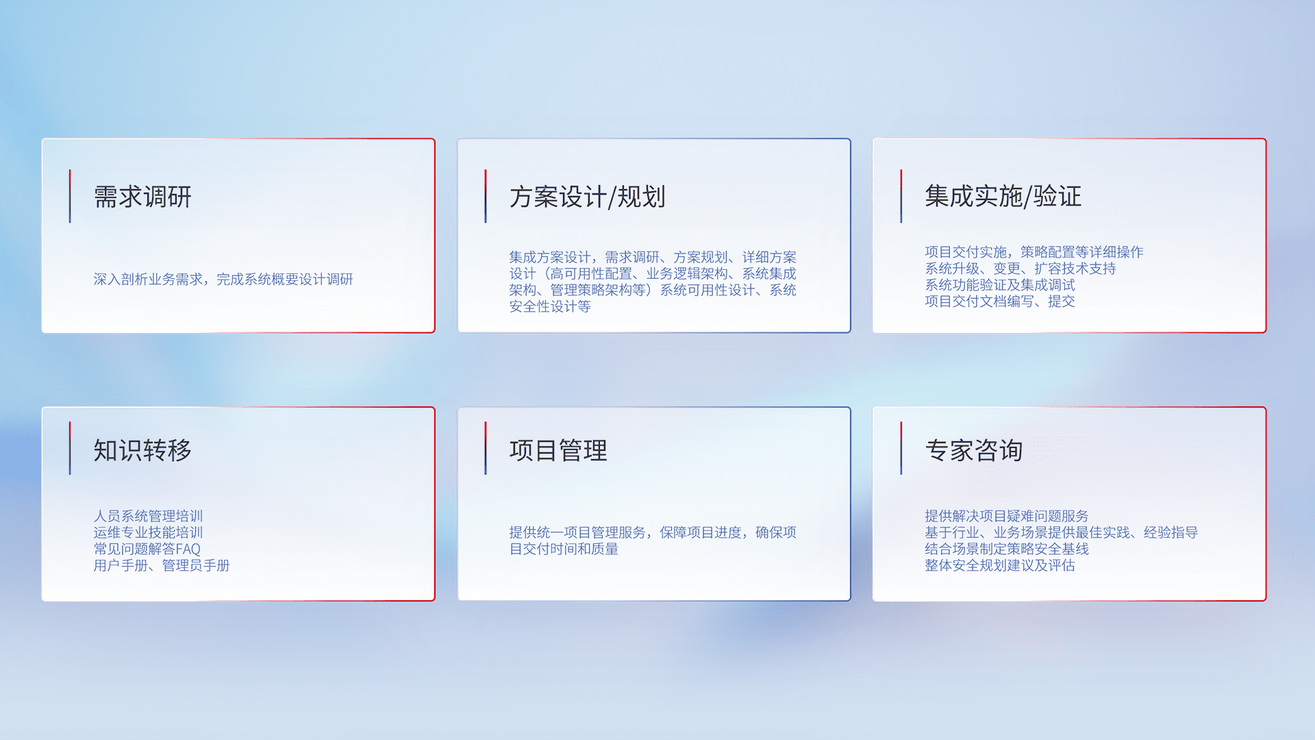 针对客户行业特性,,,,将宏观的安全战略和需求,,,通过专业的交付服务,,实现项目落地,,,为客户提供标准规范的集成交付服务。。。。